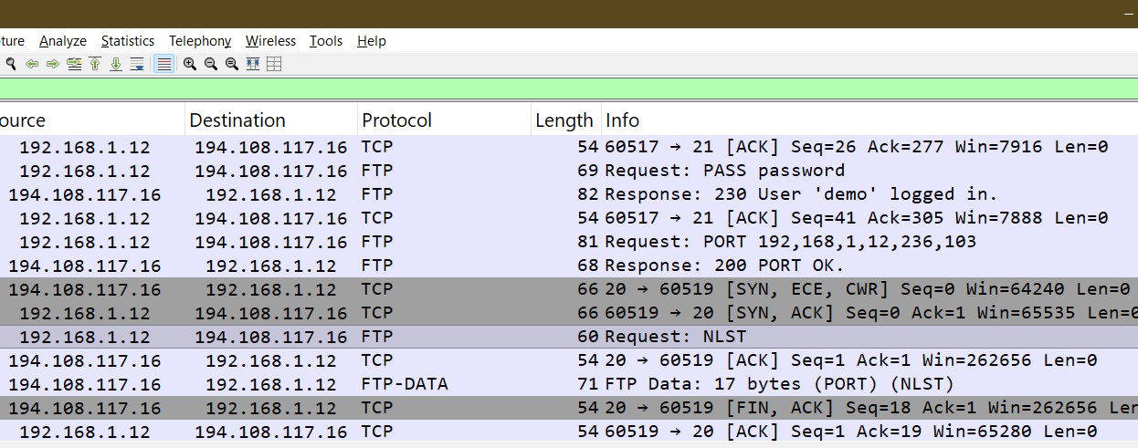 test.rebex.netis shown below:shftp> open test.rebex.net Connected to test.rebex.net. 220-Welcome to test.rebex.net! See https://test.rebex.net/ for more information and terms of use. 220 If you don't have an account, log in as 'anonymous' or 'ftp'. 200 Enabled UTF-8 encoding. User (test.rebex.net:(none)): demo 331 Anonymous login OK, send your complete email address as your password. Password: 230 User 'demo' logged in. ftp> close 221 Closing session. ftp>In Wireshark, you should see both TCP and FTP (and later FTP-DATA)